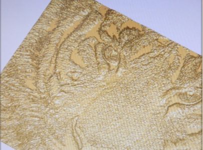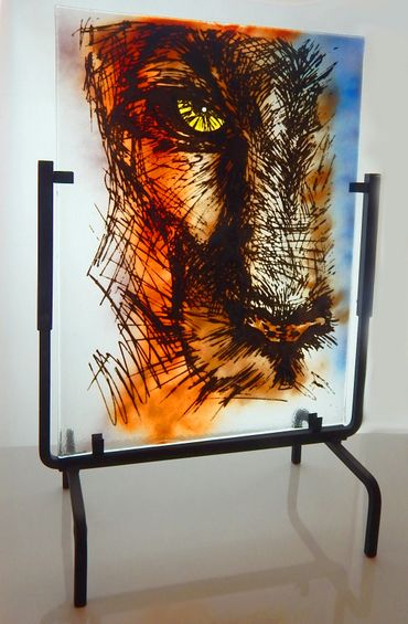 The carved glass powder and substrate glass sheet are fired in a kiln. The epoxy burns off, leaving an embossed effect of pure fused glass on top of the glass backing sheet.