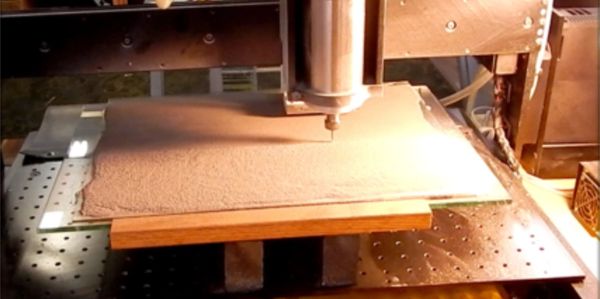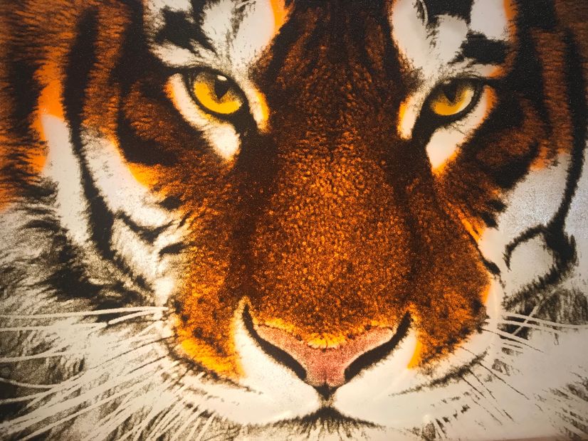 The dried frit powder is carved away by a computer-controlled machine. The machine carves the bump-map of the photo created earlier by the design software. Where the photo was dark, frit is not carved too deeply, where the photo is light, the frit is carved away. All of this carving is done in a small height region, the frit ranges from only .050” thick down to 0.00” thick (completely carved away).