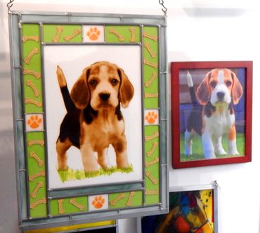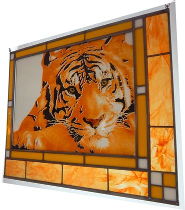Here is the final piece, with the carved frit sheet in front, and a colorful fused sheet backing it up. Please continue on to the gallery to see other examples of this technique, including multi-color frit carvings and hand colored pieces with traditional stained glass paints. If you are wondering if your photo can be converted to a custom carved glass creation, the answer is… YES!