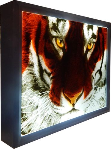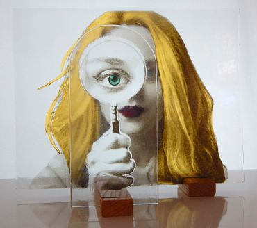 The fired glass plate feels like an embossing, in the sense that it has varying heights of fused glass on its surface. In backlight, the photographic yet painterly effect of this process can be seen. In this case, the photo is represented in a single color value…black. But the different heights of black are seen as shades of grey.